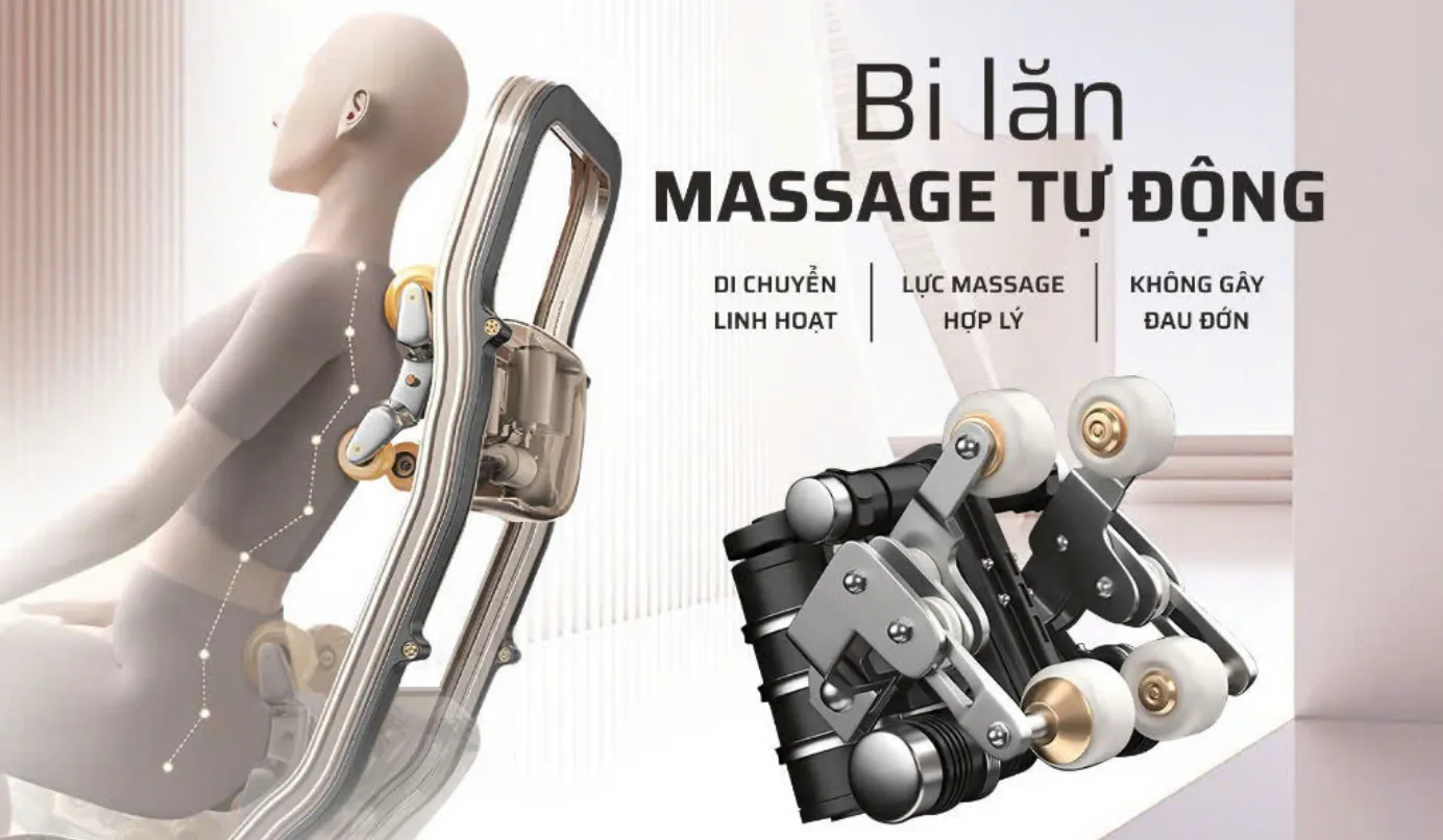 Hệ thống con lăn massage 4D thế hệ mới, có khả năng di chuyển đa chiều, mô phỏng chuyển động bàn tay chuyên nghiệp.