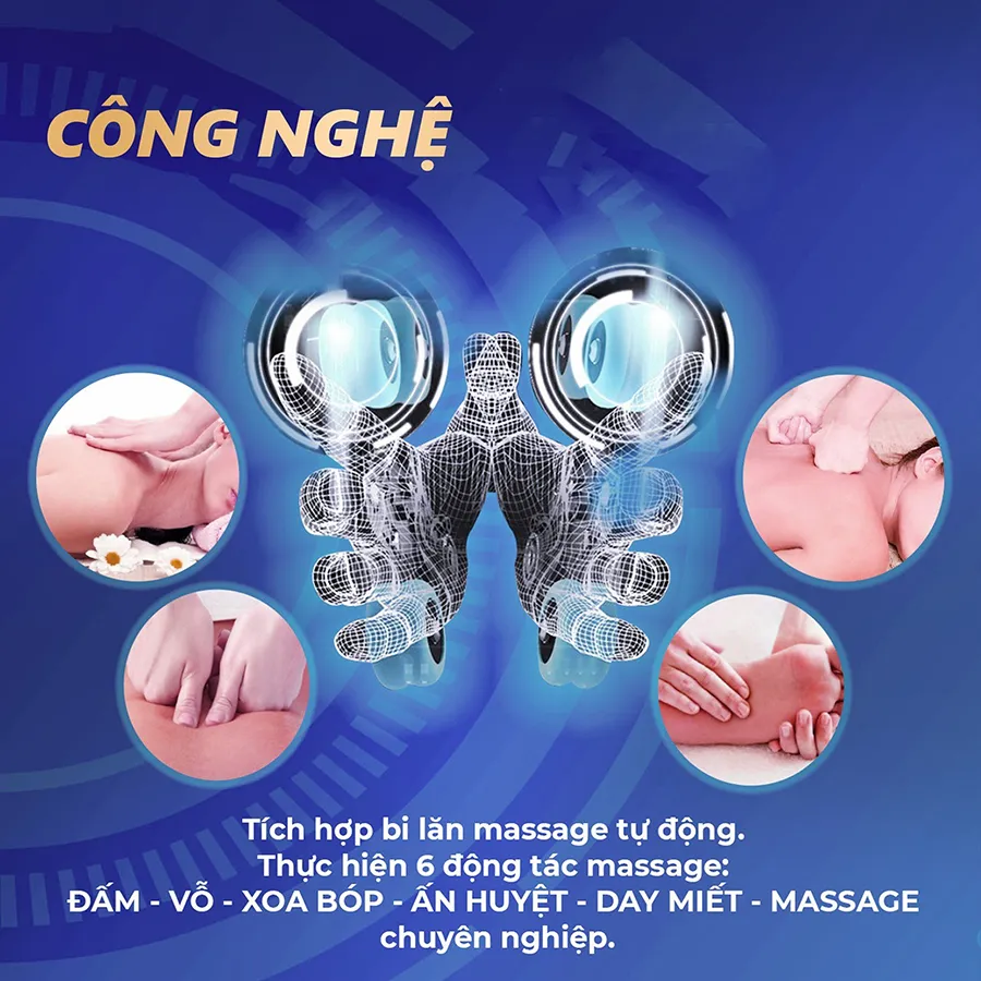 Hệ thống túi khí được bố trí trải dài khắp cơ thể, từ vai, tay đến bắp chân, bàn chân. Các chế độ massage đa dạng cho phép điều chỉnh lực bóp, giúp nâng cao hiệu quả xoa bóp, hỗ trợ lưu thông máu, giảm căng cứng cơ.