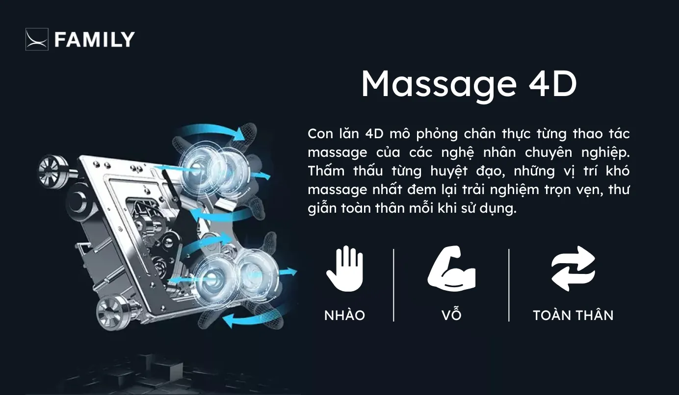 | Công nghệ con lăn | 3D/4D hiện đại | 4D/5D tiên tiến | 4D chuẩn Nhật |