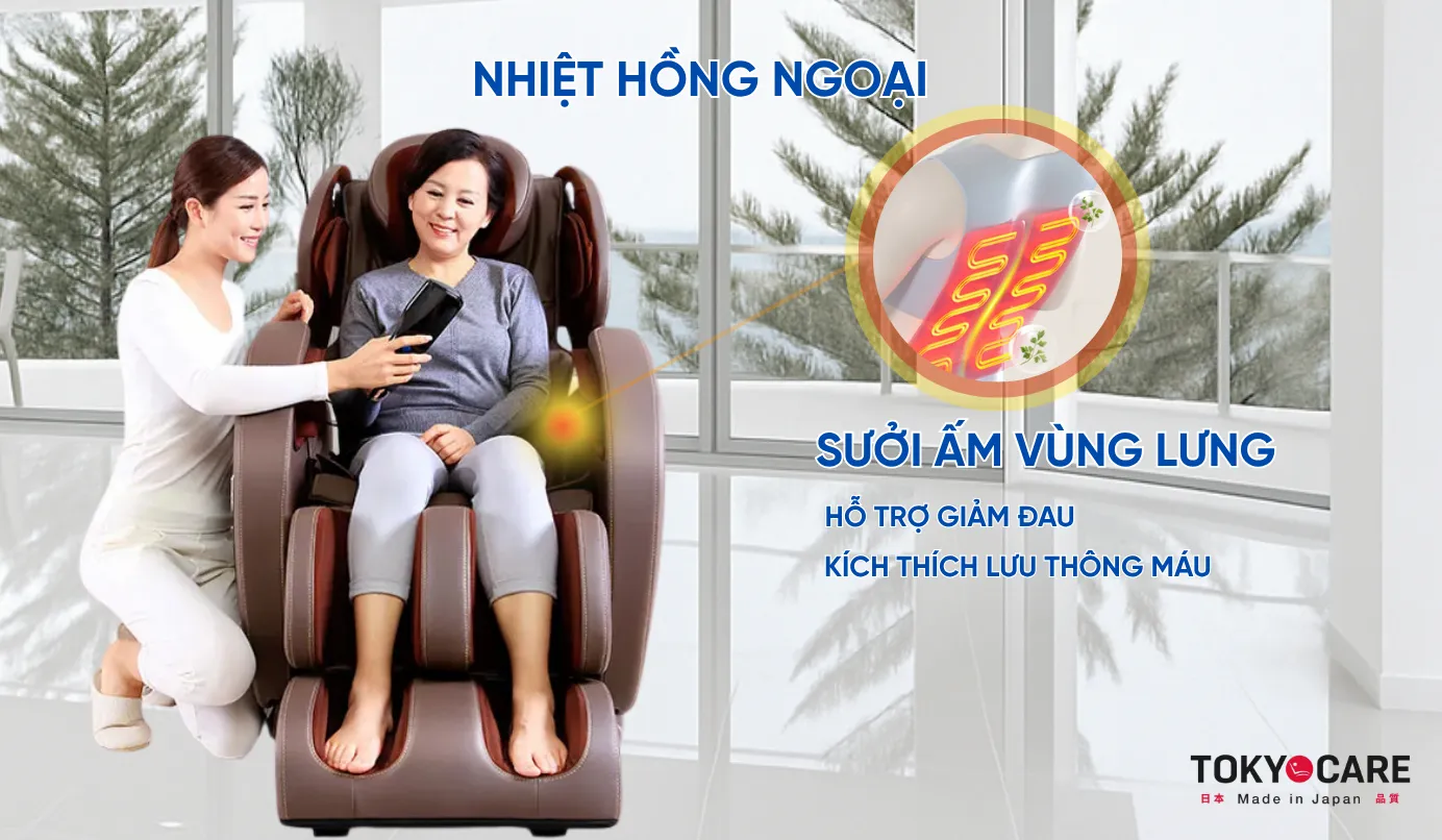 - Hệ thống nhiệt hồng ngoại giúp làm ấm vùng cơ bị mỏi, hỗ trợ giảm đau, kích thích lưu thông máu và tăng khả năng hấp thụ oxy của cơ thể. Công nghệ này đặc biệt hữu ích cho người cao tuổi, nhân viên văn phòng và những ai thường xuyên bị lạnh cơ thể hoặc tuần hoàn kém.