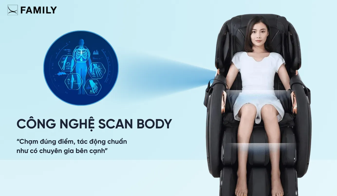 - Công nghệ AI và cảm biến Scan Body Tự động quét cơ thể người dùng để đo kích thước, chiều cao, độ cong cột sống và khu vực bị căng cứng. Từ đó, ghế sẽ cá nhân hóa chương trình massage phù hợp với từng thể trạng, giúp nâng cao hiệu quả thư giãn, đồng thời tránh tình trạng massage sai điểm, sai lực.